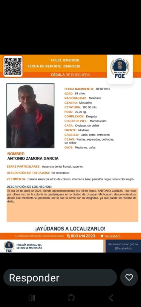 Se solicita su apoyo para localizar a ANTONIO ZAMORA GARCÍA, visto por última vez el 08 de abril de 2026 en la colonia