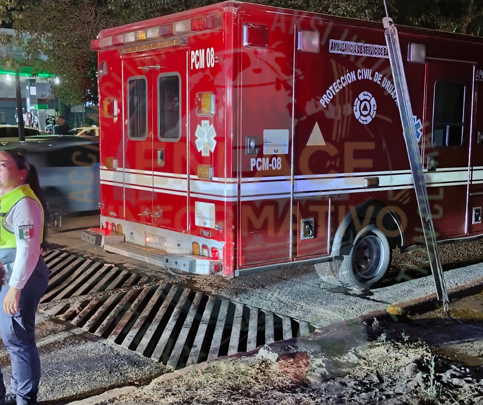 El percance ocurrió entre una ambulancia de Protección Civil Municipal (unidad PCM-08) y un vehículo compacto marca Renault, línea Megane, color gris, con placas de circulación PUD-951-B de Michoacán.