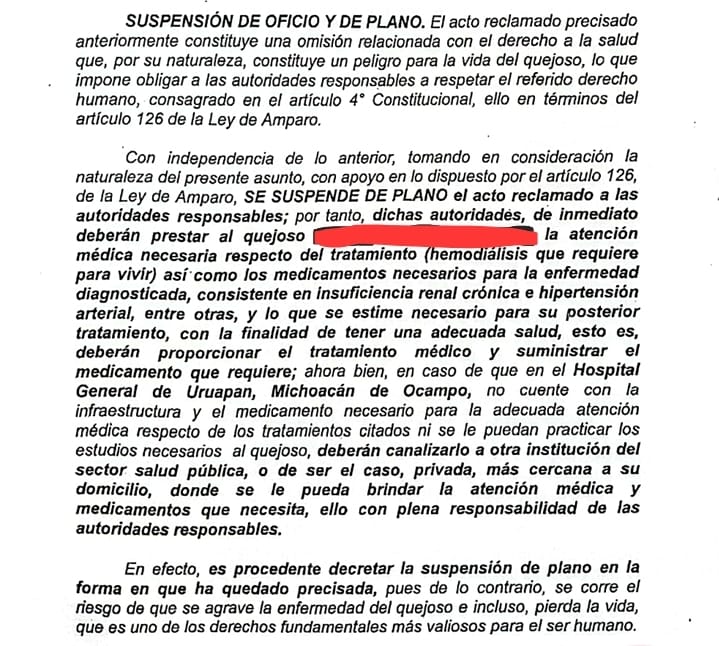 El juez ordenó expresamente que las autoridades responsables deben proporcionar la atención médica necesaria de manera inmediata y sin condicionamiento alguno. Asimismo, estableció que, si el Hospital General de Uruapan no cuenta con la infraestructura adecuada, los pacientes deben ser canalizados a otra unidad de salud pública donde reciban el tratamiento oportunamente y sin costo.Los afectados solicitaron la intervención urgente de las autoridades estatales y federales para garantizar el cumplimiento del amparo, así como la atención de los medios de comunicación para visibilizar esta problemática.