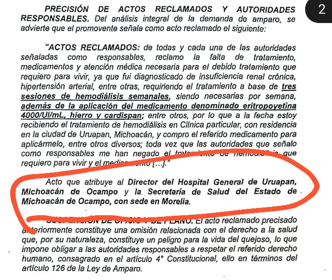 De acuerdo con la resolución judicial, el servicio de hemodiálisis (en Prolongación de Veracruz 401, Lomas del Valle Sur), habría sido otorgado de forma subrogada por la Secretaría de Salud de Michoacán (SSM) en dicha clínica privada, bajo la obligación de garantizar hasta cuatro sesiones semanales gratuitas para los pacientes amparados, además de medicamentos como eritropoyetina 4000 UI/mL, hierro y cardiopina.