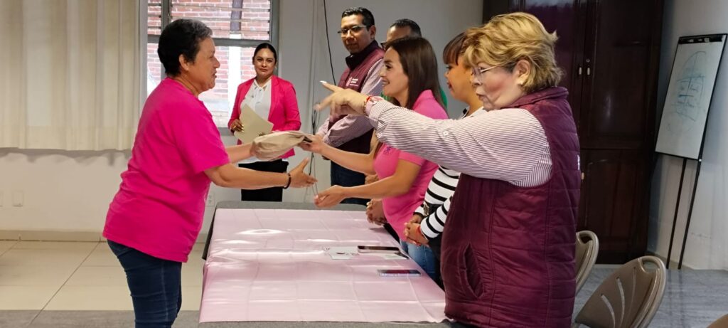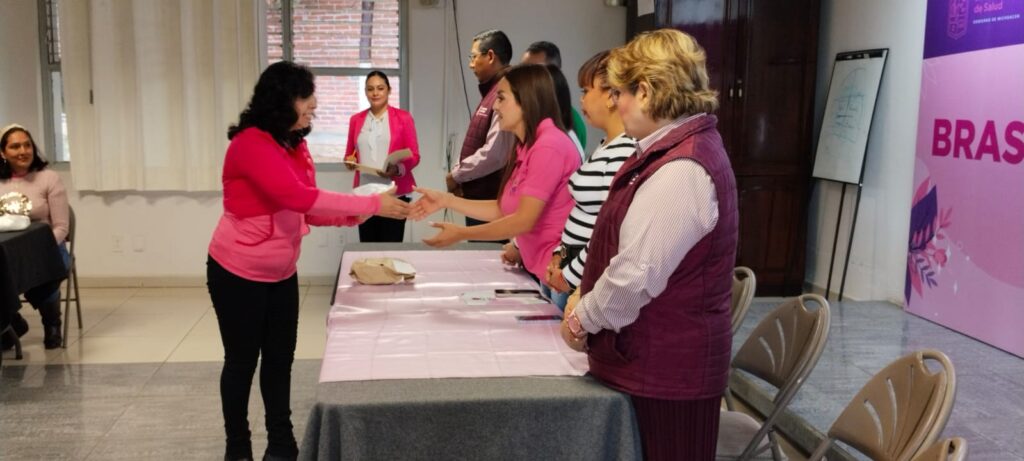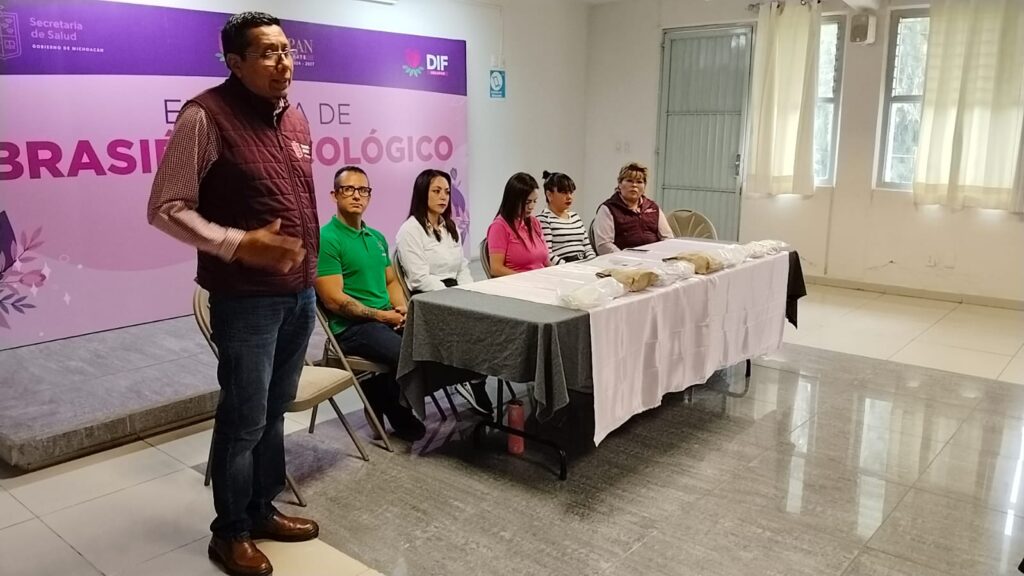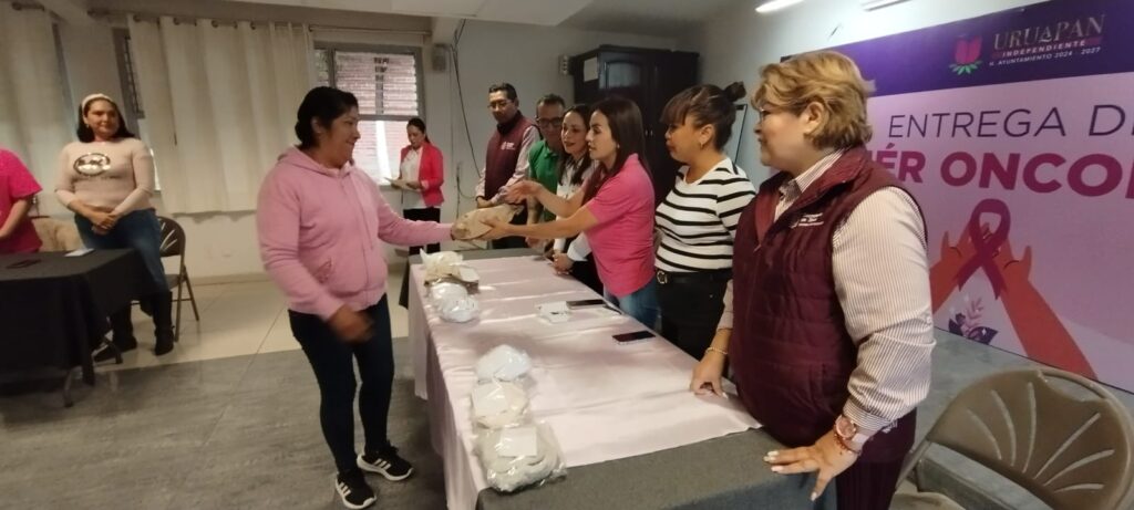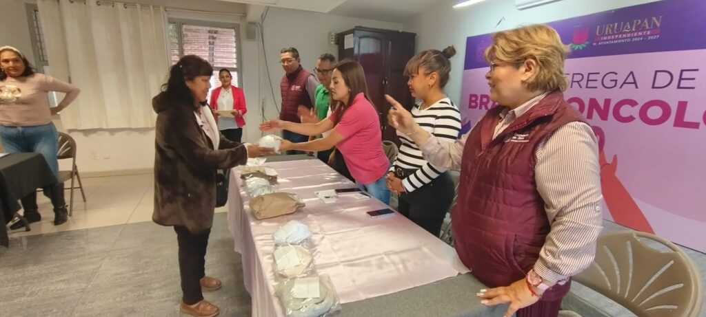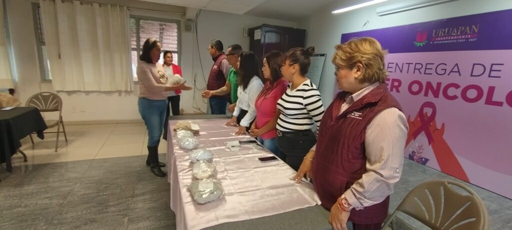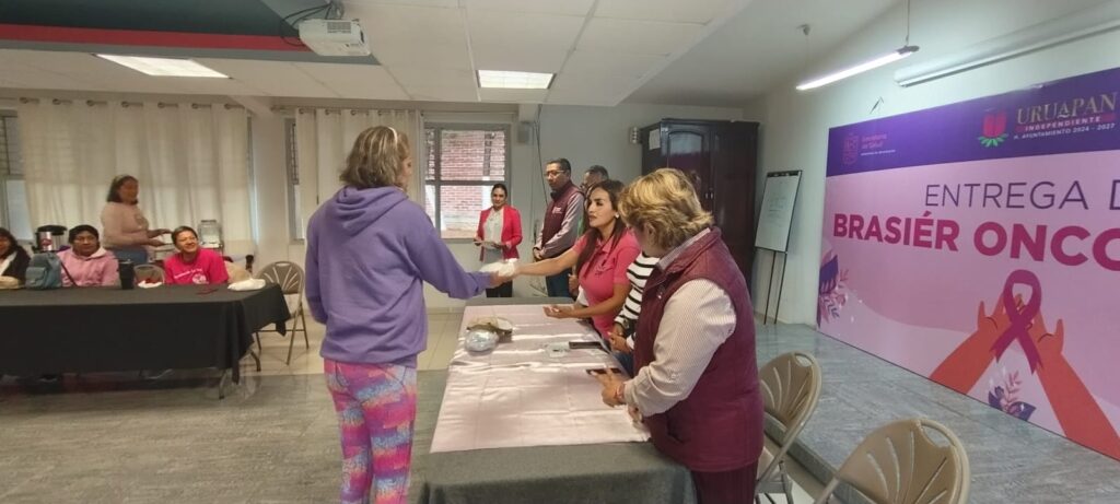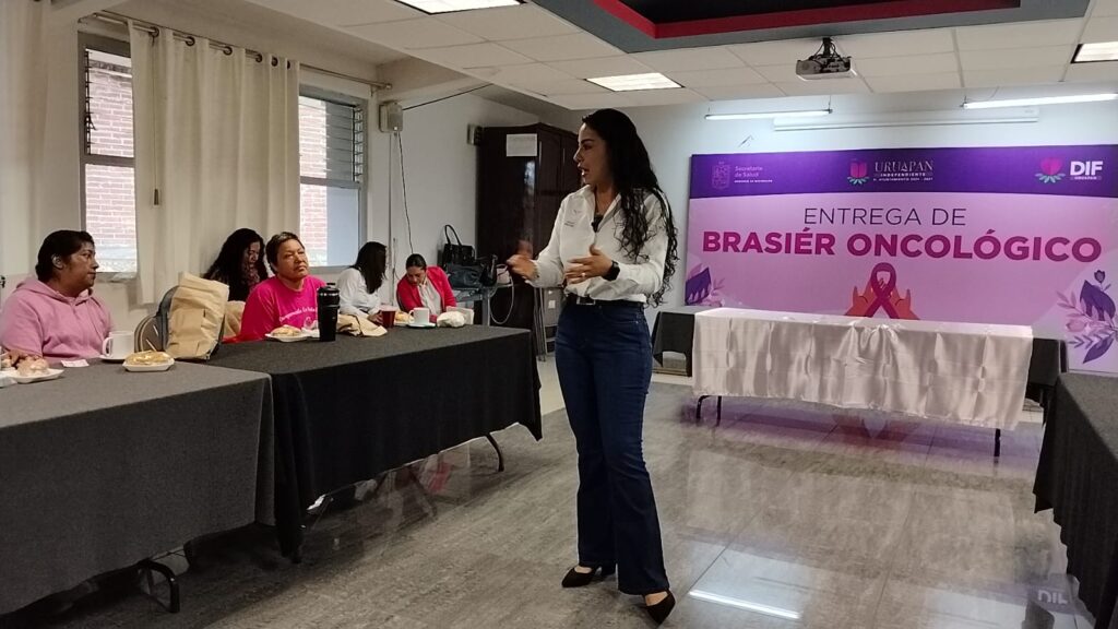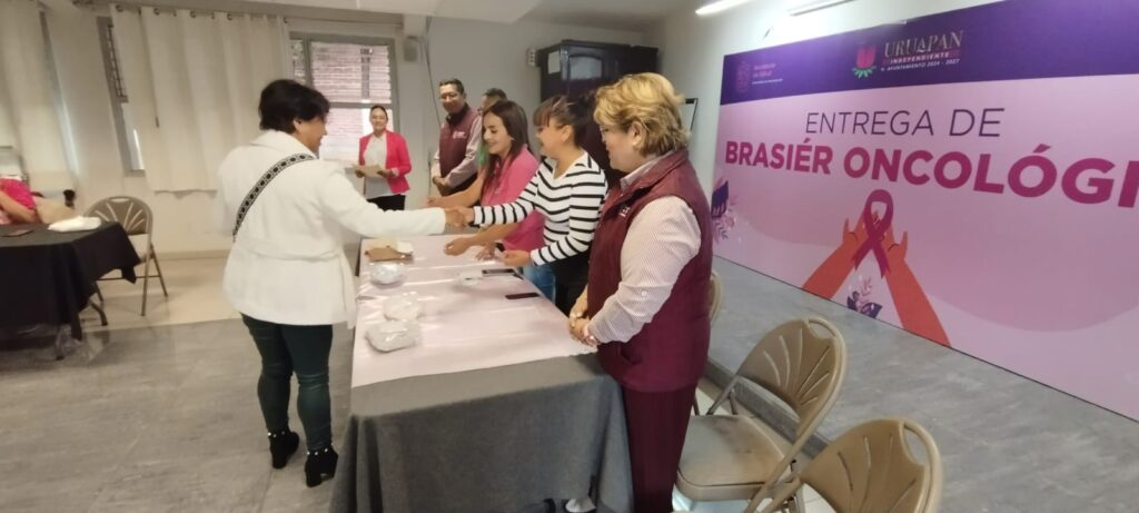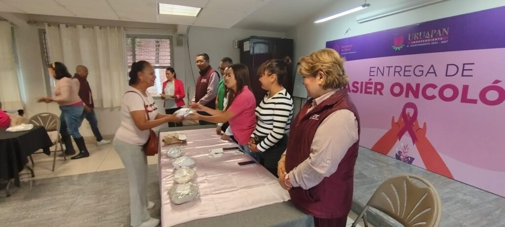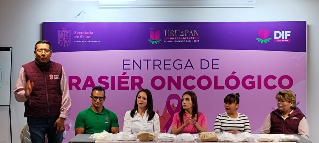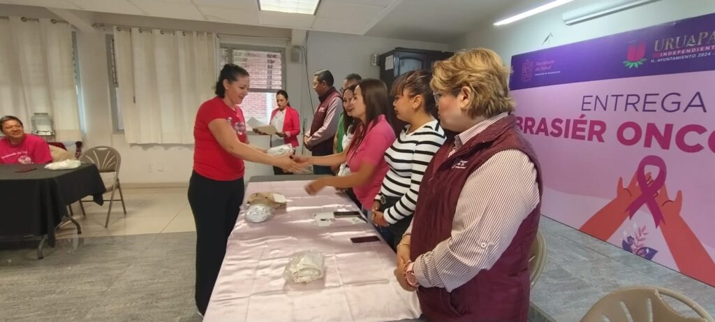 Uruapan, Mich. – Autoridades sanitarias encabezaron la entrega de 16 brasieres oncológicos a mujeres afectadas por el cáncer de mama, reforzando el compromiso por la prevención, detección oportuna y acompañamiento en el proceso de recuperación, en emotivo acto realizado en el aula virtual del ayuntamiento en Zumpimito, donde participaron los responsables del sistema DIF.