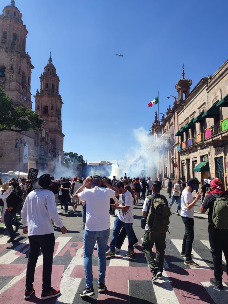 Morelia, Michoacán.- Por segundo día consecutivo se registraron enfrentamientos entre estudiantes y elementos de la Secretaría de Seguridad Pública durante las manifestaciones por el asesinato del presidente municipal de Uruapan, Carlos Manzo.