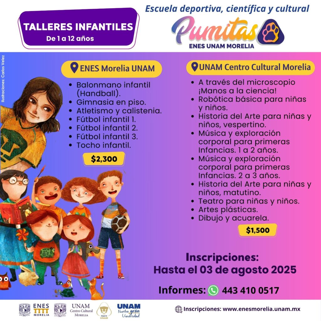 Para mayores informes e inscripciones a estos talleres infantiles de “Pumitas. Escuela deportiva, científica y cultural”, puedes comunicarte al WhatsApp 4434 100 517; escribir a través del Facebook o Instagram oficial del UNAM Centro Cultural Morelia; y mediante centrocultural@enesmorelia.unam.mx.